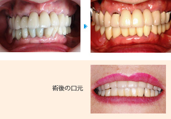 術後は写真の通り上と下の歯の噛み合わせがきれいにでき、そのうえ下の歯は入れ歯ではなく、ブリッジで取り外しをしなくてよくなりました。